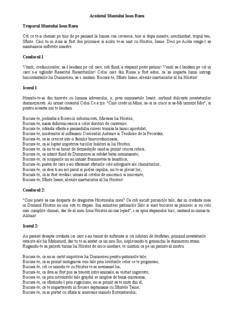 Troparul sfântului ioan rusul glasul al 8 lea cel care te a chemat pe tine de pe pământ la lumea cea cerească ţine şi după moarte neschimbat trupul tău sfinte. Ioan rusul s a născut într un sat din rusia la sfârșitul veacului al șaptesprezecelea pe timpul împărăției lui petru cel mare anul cel mai probabil al nașterii sale este 1690 și aceasta deoarece sfântul a participat ca soldat la războiul pe care îndrăznețul țar l a întreprins împotriva turcilor în anul 1711. Acatistul sfintelor şi mântuitoarelor patimi ale domnului nostru iisus hristos. Acatistul sfintei mironosiţe întocmai cu apostolii maria magdalena.
