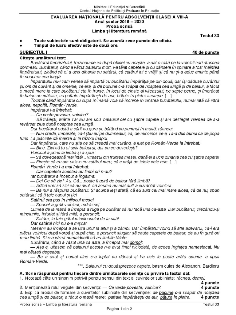 En Viii Limba Romana 2020 Testul 2 Pdf