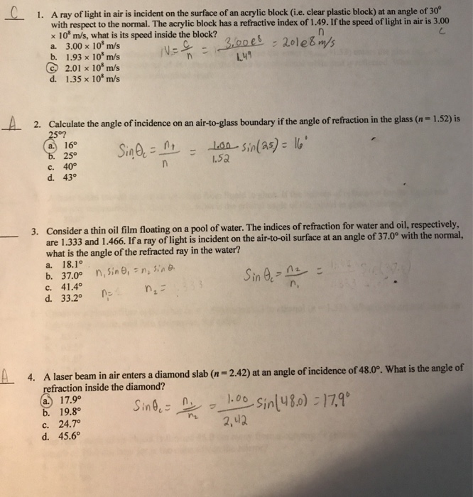 Index Of Refraction Snell S Law Questions After Textbook