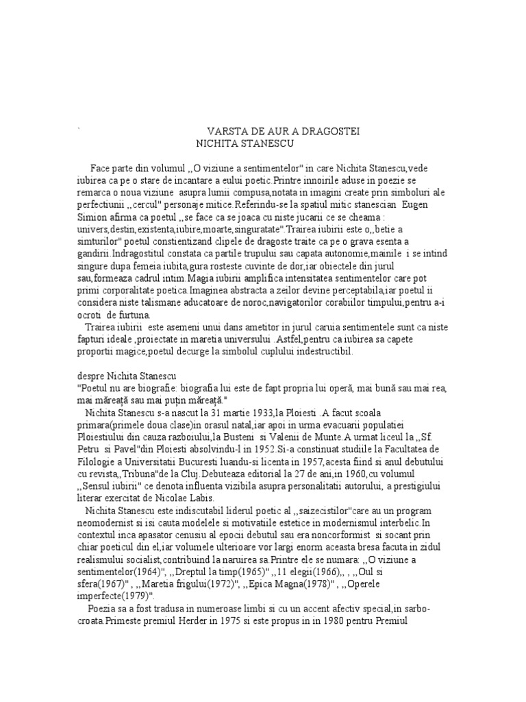 Varsta De Aur A Dragostei De Nichita Stanescu